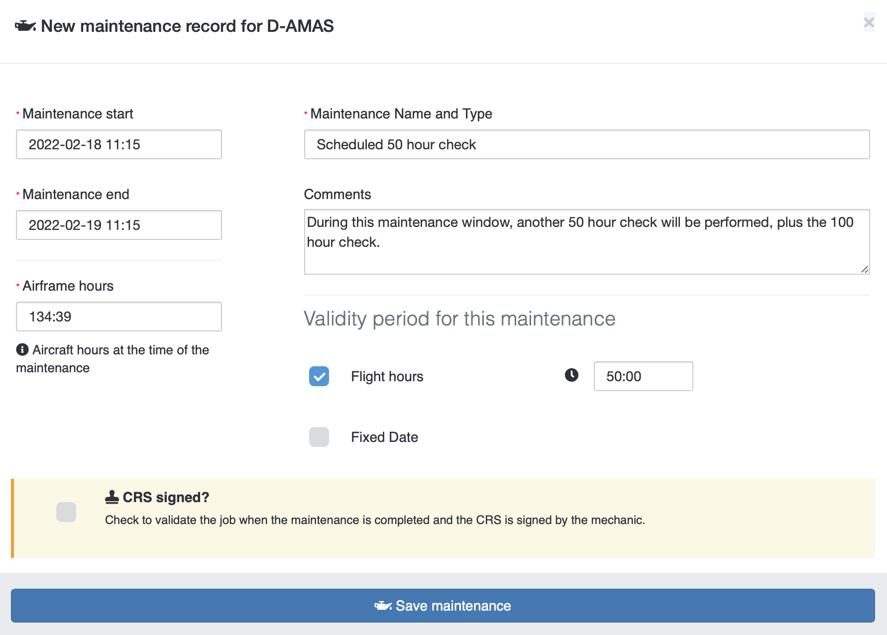 The new maintenance record window will pop up: