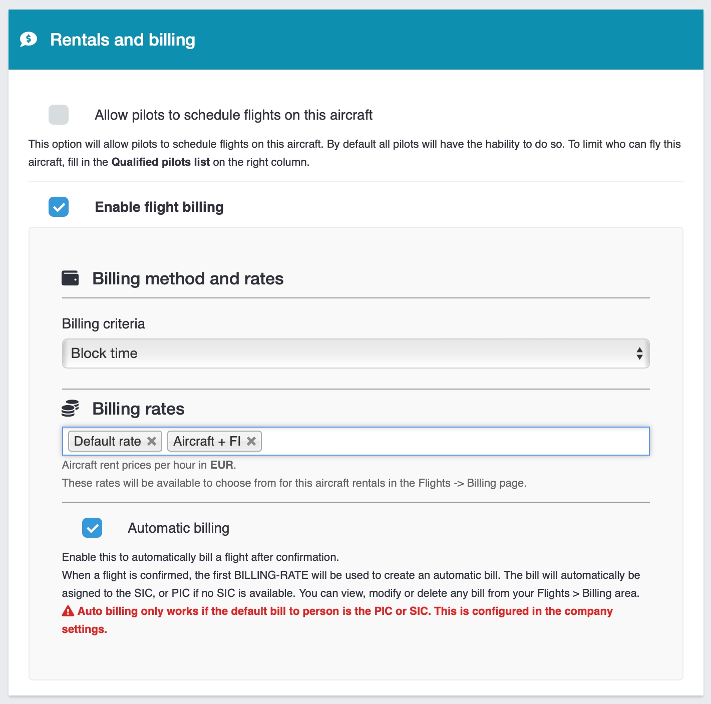 Once you have created your rates, you can enable flight billing on your aircraft.