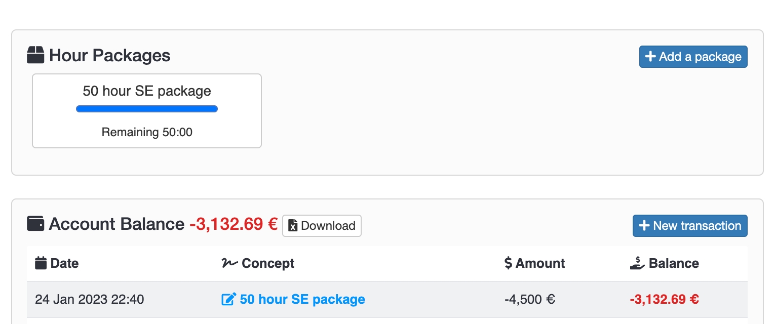 Once you have associated the rates and packages to the aircraft, you can go into any pilot´s profile page, click on the billing tab, and ad the purchased packages as required.