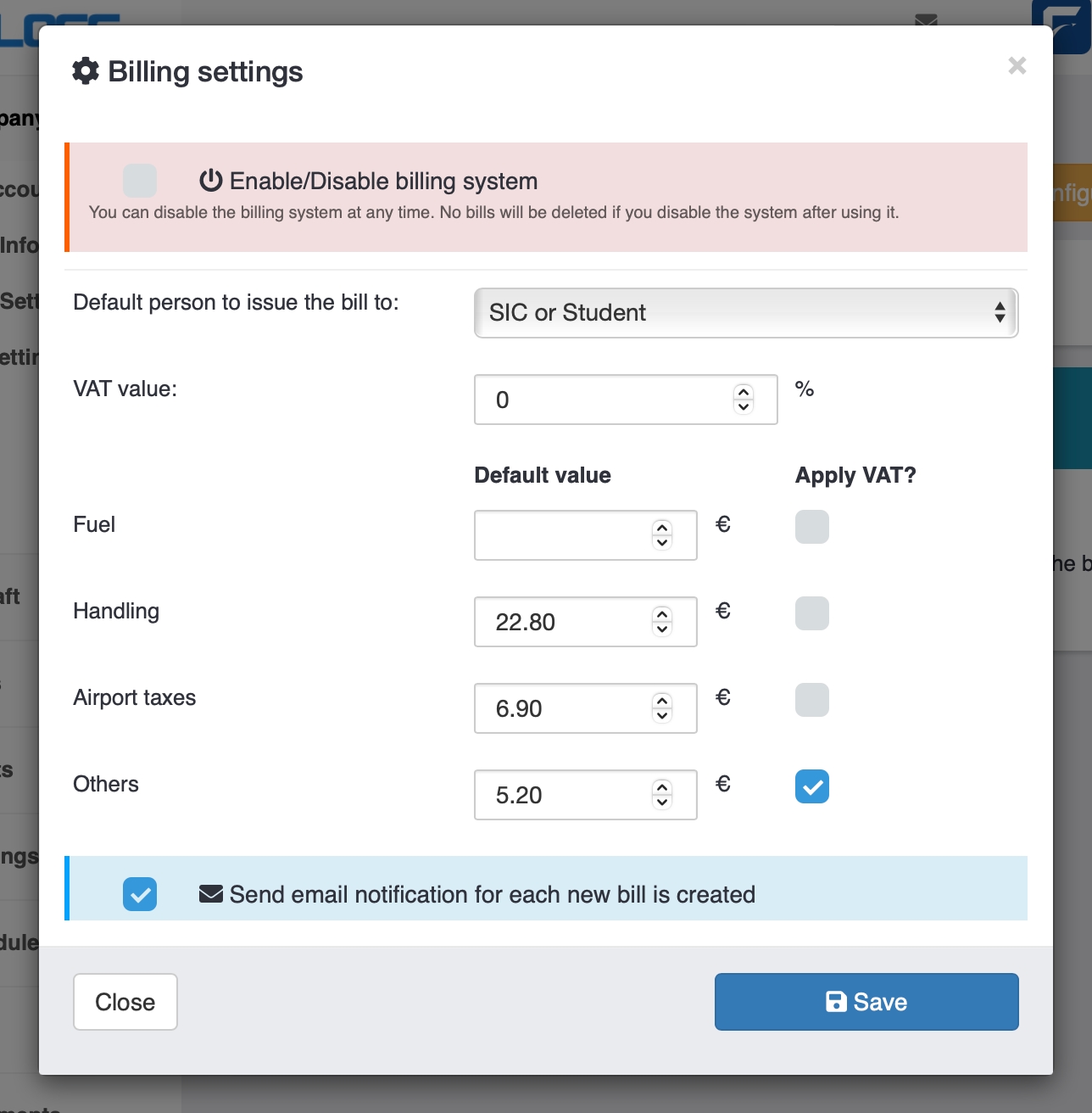 Once you click on the Configure billing button, a modal window will open with options to activate the system and configure various other options, like VAT, other expenses and the option to automatically send an email notification when the bills are created.
