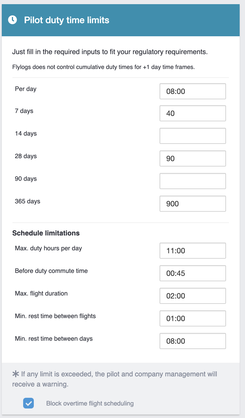 customize pilot duty time limitations.