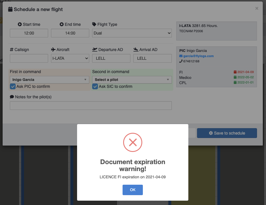 If any certificates are expired, a visual alert will pop up, and depending on your company settings, it will block the pilot from being scheduled.