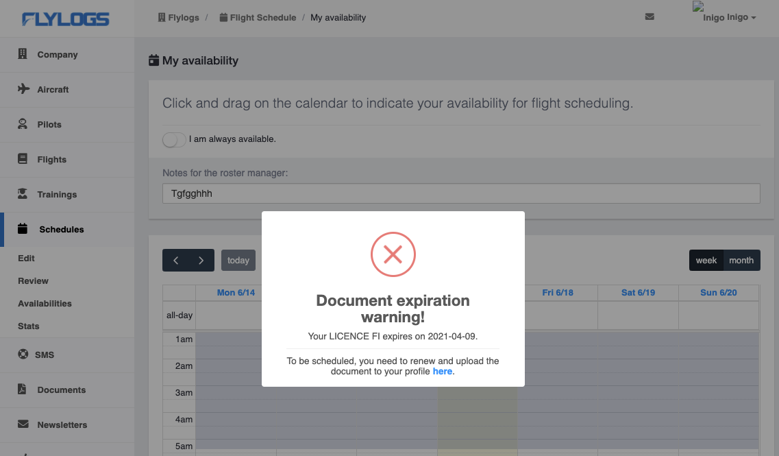 For example; A pilot with an expired license will not be able to publish schedule availability if any of his/her licenses are expired - like shown in the image below.