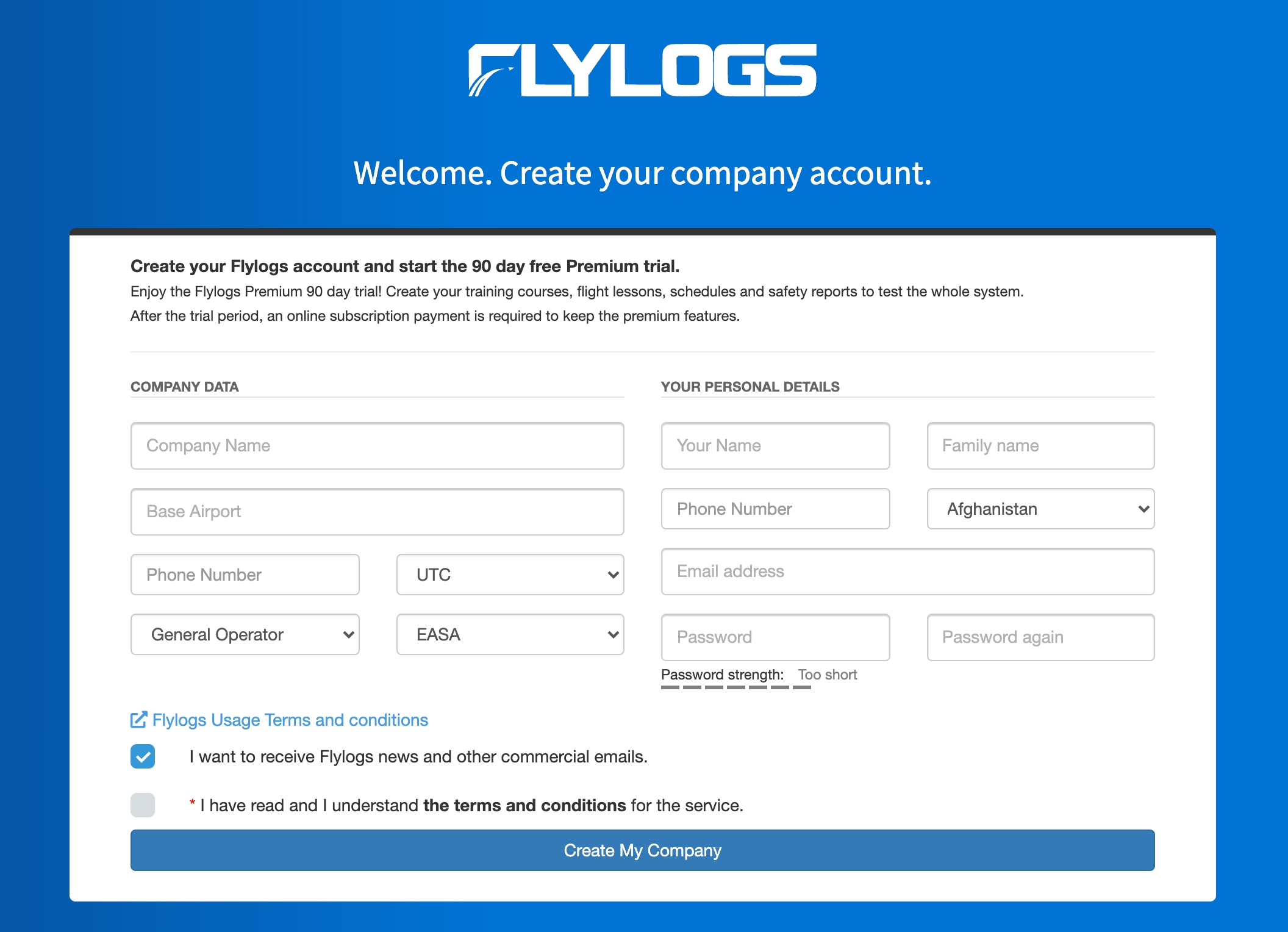 You should only create a new Flylogs account if you own or work in an aviation company at the management level. You will need a corporate email address with @aviationcompanyname.tld.