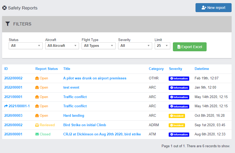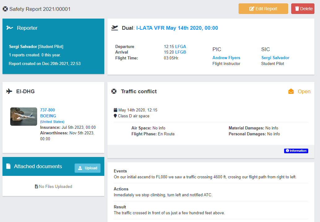 These reports can be specifically related to a flight, or not, allowing any of your users to inform about more other types of risks.