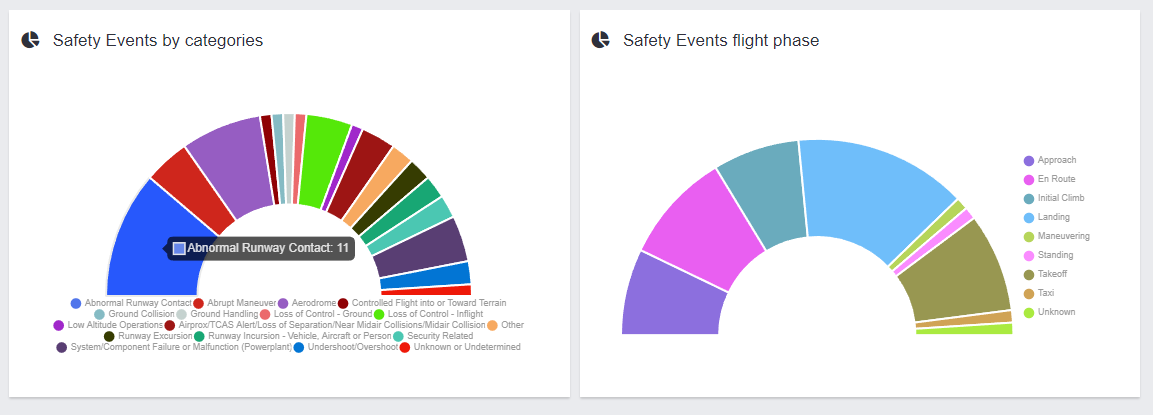 For that reason, our SMS tool displays all relevant data, in a few charts that automatically summarize your safety events categorized by type, phase of flight, type of flight and other important categorizations.